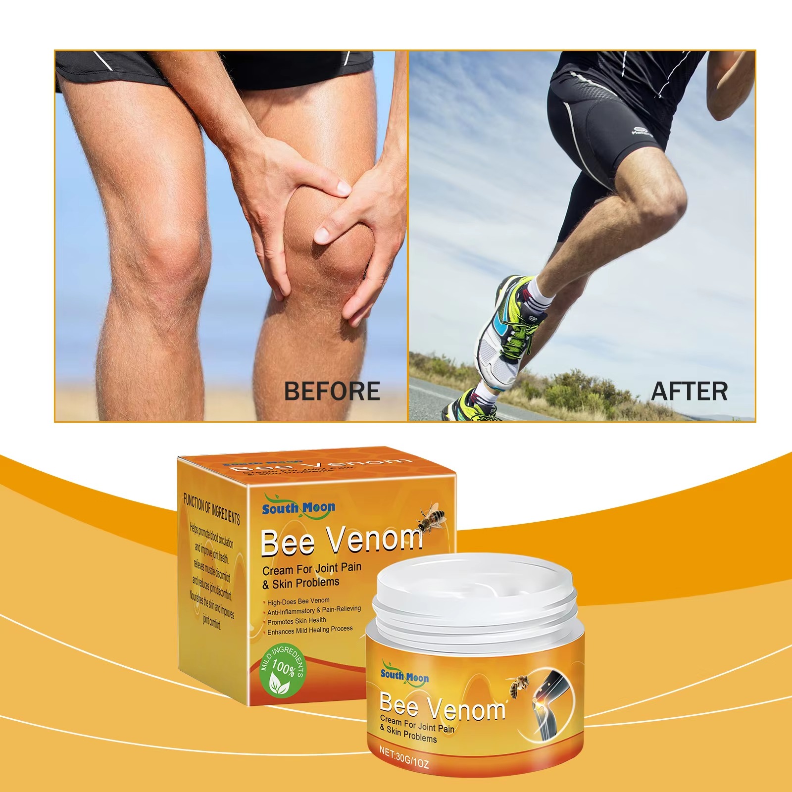 Bee Venom-এর Melittin + Peptide উপাদান ত্বকের নিচে দ্রুত কাজ করে উষ্ণ আরামের অনুভূতি দেয় এবং শক্ত হয়ে যাওয়া জয়েন্ট ঢিলে করতে সাহায্য করে।